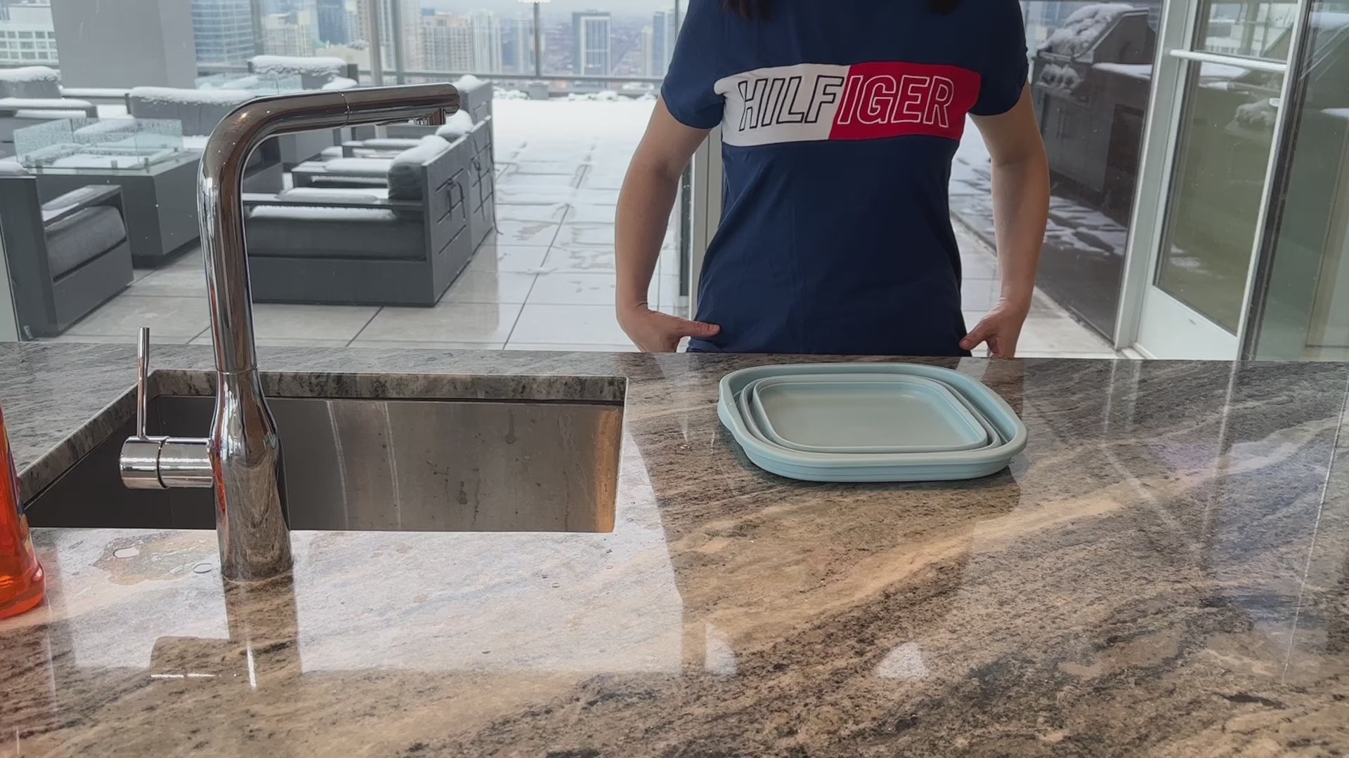 Einzelheiten: **Zusammenklappbare rechteckige TPE/PP-Wanne **Marke: SAMMART **Material: TPE und PP **Erweiterte Größe: 29,5 x 27,8 x 13 (h) cm **Zusammengeklappte Größe: 29,5 x 27,8 x 3,8 (H) cm **Fassungsvermögen: 5,5 l